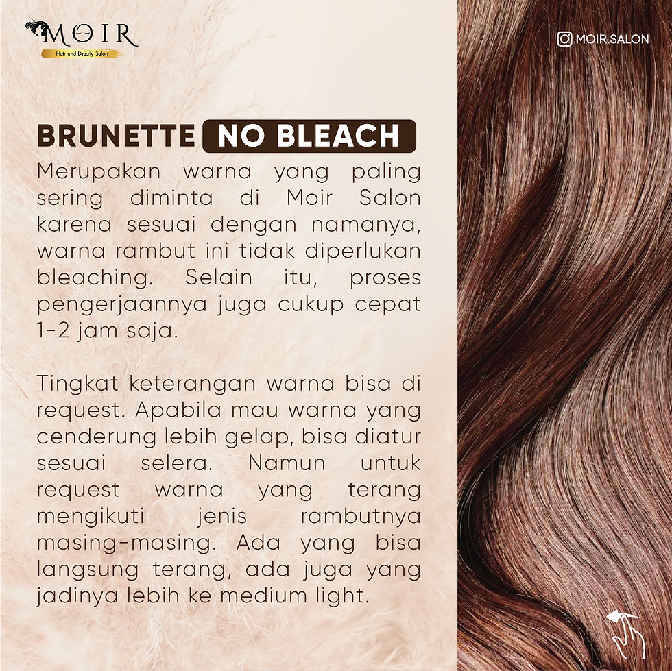 2. Brunette no Bleach, adalah salah satu tone warna yang paling diminati di Moir Salon. Selain karena warnanya cantik, teknik pewarnaan ini tidak melalui proses bleaching, sehingga meminimalisir kerusakan rambut. Untuk proses pengerjaannya pun cukup cepat jika dibandingkan dengan pewarnaan warna lainnya, yaitu cukup 1-2 jam saja bestiee.